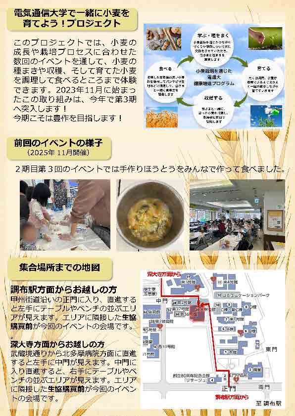 「電気通信大学で一緒に小麦を育てよう!」プロジェクト第3期 第1回イベントとして、「小麦の種をまいて豊作を願いながらおいしいパンとともに歓談しよう!」を下記のとおり開催いたします。