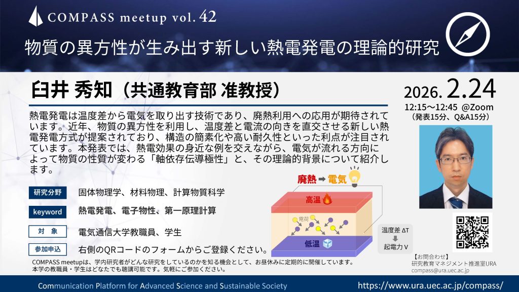 熱電発電は温度差から電気を取り出す技術であり、廃熱利用への応用が期待されています。近年、物質の異方性を利用し、温度差と電流の向きを直交させる新しい熱電発電方式が提案されており、構造の簡素化や高い耐久性といった利点が注目されています。本発表では、熱電効果の身近な例を交えながら、電気が流れる方向によって物質の性質が変わる「軸依存伝導極性」と、その理論的背景について紹介します。